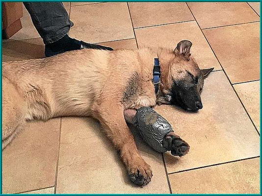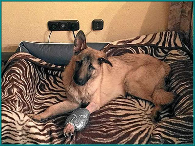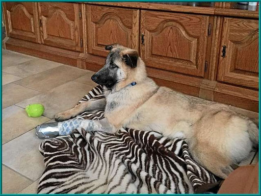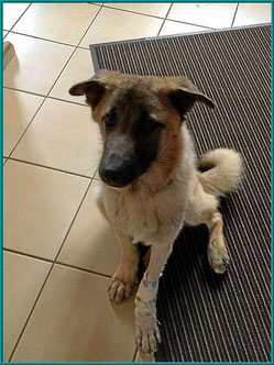 meine Reise ins schöne Kalenborn hat leider nicht so rosig begonnen. Bereits im Tierheim habe ich mir ein Band gerissen und es hat sich eine Zyste auf meinem Knochen gebildet. Also musste ich mit meinem Herrchen zum Tierarzt. Ich musste mittlerweile 3 Operationen über mich ergehen lassen und war gefühlt jede Woche zwei Mal beim Tierarzt. Einmal rein mit dem Metall, einmal das Metall umgedreht und einmal raus mit dem Metall. Zwischendurch hatte ich Entzündungen im Bein, die mir zusätzliche Schmerzen bereitet haben, weshalb ich auch öfter beim Onkel Doktor gewesen bin. Jetzt muss ich nur noch warten, bis mir der doofe Verband abgenommen wird und ich endlich wieder spielen kann. Frau Dr. Baronetzky in Mayen hat wirklich super Arbeit geleistet. Außerdem bin ich immer noch ganz dünn. Ich hoffe, dass ich in Zukunft beschwerdenfrei leben kann und nie wieder Hunger haben muss.