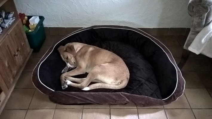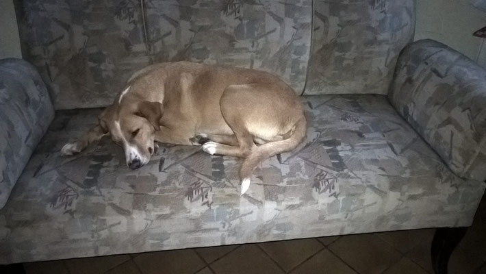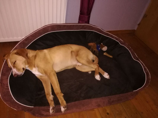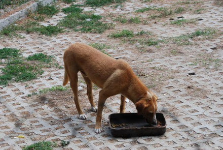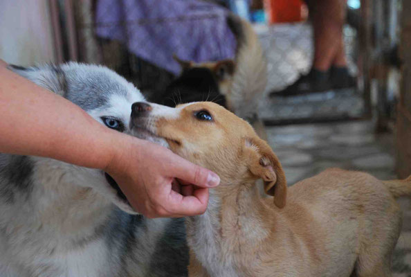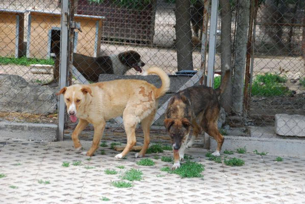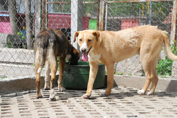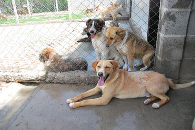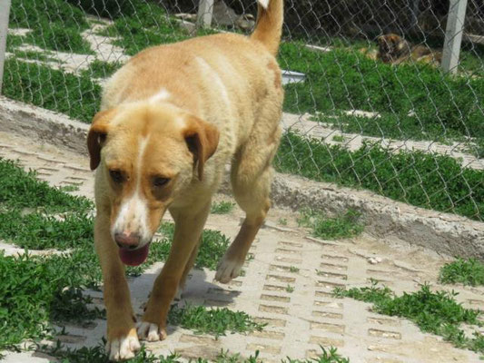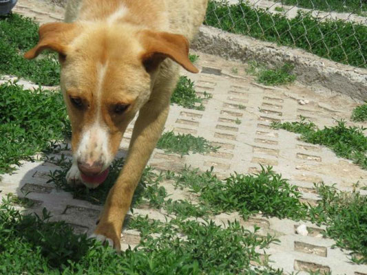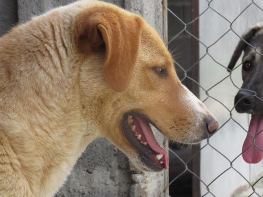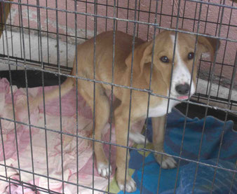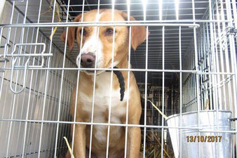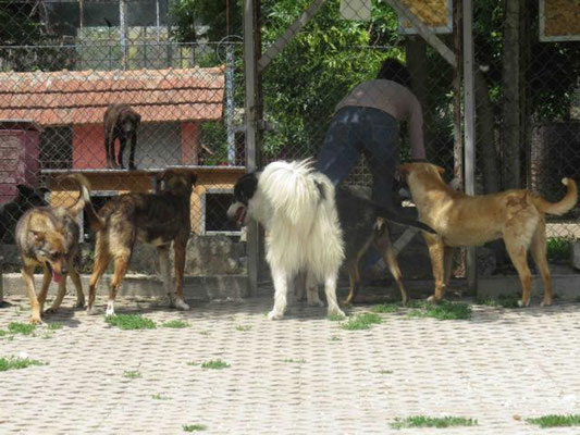 Leider sitzt er im Moment in einer Gitterbox, da er offene Stellen an der Haut hatte und diese erst behandelt werden müssen. Danach darf er selbstverständlich wieder zu den anderen Hunden.