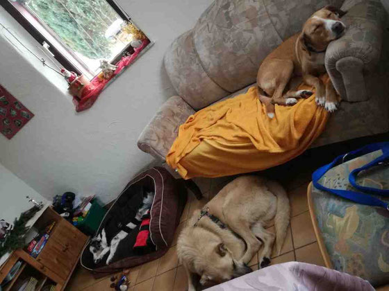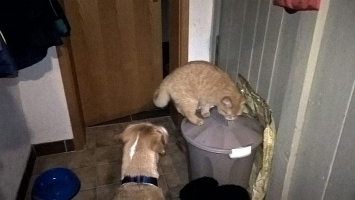 Mit den Katzen kommt er inzwischen prima zurecht. Er schafft freiwillig Raum, so dass die Katzen sich ungestört bewegen können.