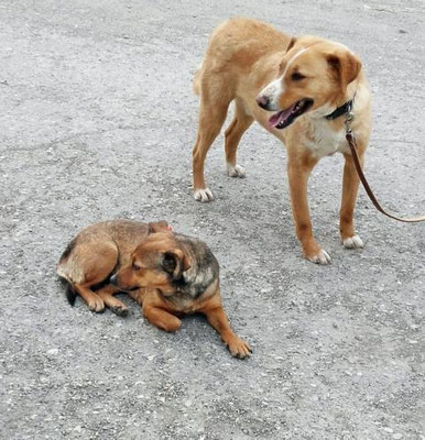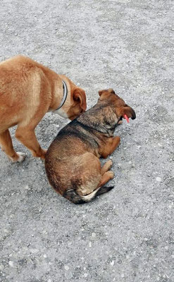 Mit anderen Hunden zusammen bleibt er bis jetzt 4-6 Stunden problemlos alleine. Er bellt so gut wie nie, nur wenn ihn etwas ängstigt, brummt er.
