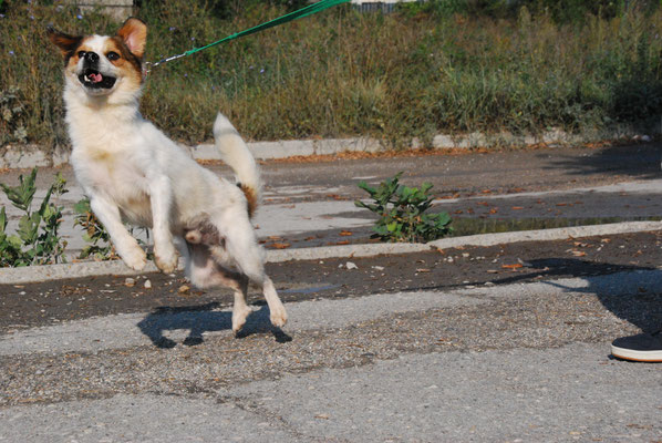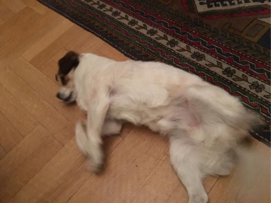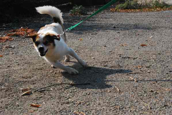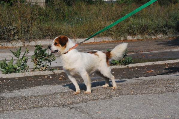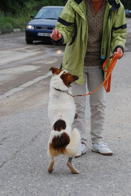 Carlo ist beim Gehen leicht ataktisch, das bedeutet, dass er sich manchmal nicht richtig koordinieren kann und stolpert. Dies könnte die Folge einer überlebten Staupe-Erkrankung sein (die jedoch vollkommen verheilt ist; er wurde ja auch geimpft als er ins Tierheim kam und hat nun den vollen Impfschutz). Durch Staupe kann eine Ataxie entstehen. Möglich ist auch, dass Carlo unter Rachitis leidet, weil seine Gelenke relativ weich sind und er einen weichen Bandapparat hat. Carlo kommt damit wunderbar zurecht, er hat eine wahnsinnige Lebensfreude und freut sich über jeden Spaziergang. Er wird nie ein Hochleistungssportler werden, aber er bewegt sich sehr gerne!