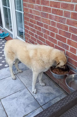 Gestern hat sie nicht gefressen, weil mein Mann sich gerade im Flur den Mantel ausgezogen hat. Dafür hat Dunja meinen Mann, der die ganze Woche nicht da war, freudig und mit Hingabe begrüßt. Sie hält uns auch immer ihre Bauch- und Brustseite hin, damit wir sie kraulen sollen.