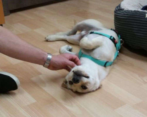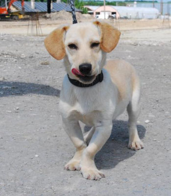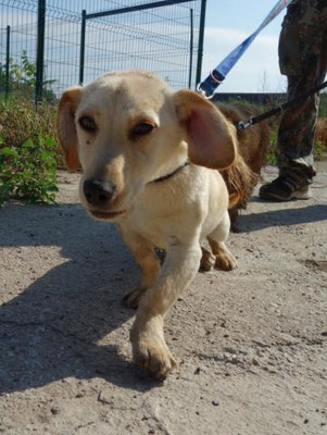 Dingo hat leider an seinen Vorderbeinen eine angeborene Fehlstellung, d.h. er steht auf beiden Seiten mit den Vorderpfoten nach außen. Diese Fehlstellung behindert ihn aber keineswegs beim Laufen.