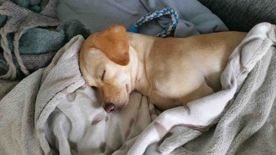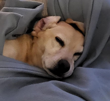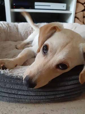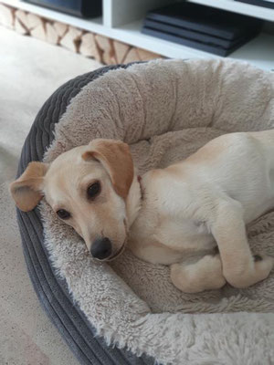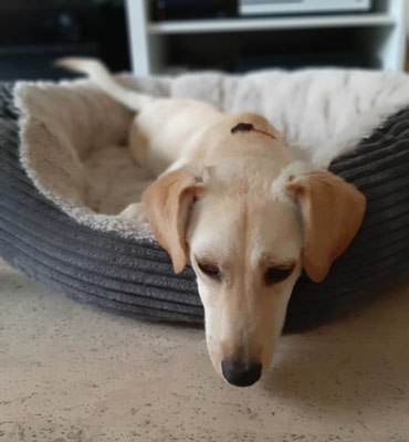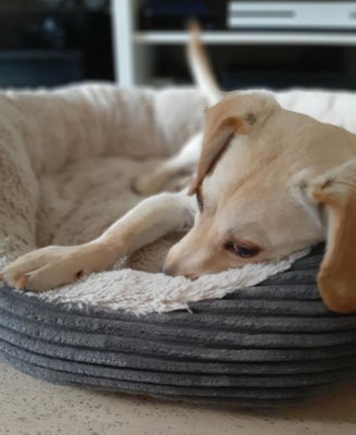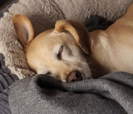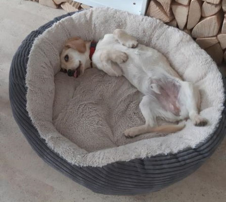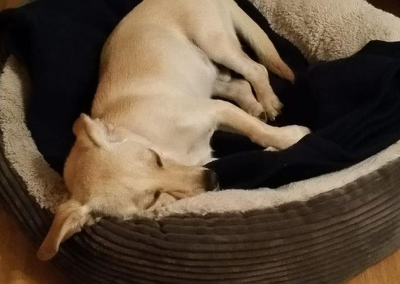 Abends kuschelt sich Dingo gerne in sein Körbchen und genießt die Ruhe. Wir hören die ganze Nacht nichts von ihm und wenn wir ihn morgens rufen, ist die Freude umso größer.