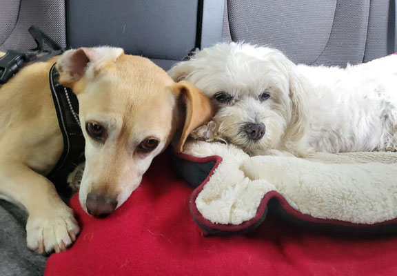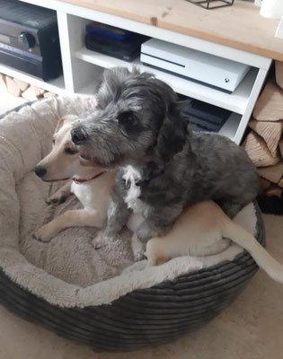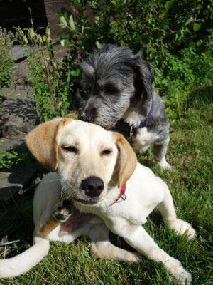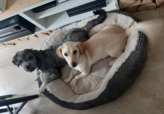 Dingo und Sophie sind richtig dicke Freunde geworden. Sie spielen und kuscheln den ganzen Tag zusammen!