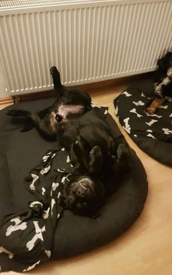 Garet ist jetzt seit drei Monaten bei uns und wir sind sehr froh, dass er bei uns ist. Bis auf eine hartnäckige Ohrentzündung, die aber auch endlich besser wird, ist er gesund und immer fröhlich. Silvester hat ihn erwartungsgemäß überhaupt nicht beeindruckt und er hat beim Feuerwerk vor sich hin geschnarcht.