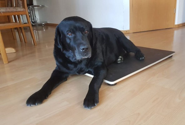 Sein aktuelles Gewicht ist 52,4 Kilo und mit jedem Kilo, dass er verliert, wird er beweglicher. Mittlerweile schafft er schon 3,5 Kilometer, braucht aber noch eine gute Stunde dafür. Zusätzlich wird der Muskelaufbau bei der Physiotherapie auf dem Wasserlaufband gefördert. Allerdings läuft er nur bei entsprechendem Lockmittel in Form von Trockenfutter, das er sonst Zuhause bekäme. Er liebt das Wasser und nimmt jede Pfütze mit. Wir sind schon sehr gespannt, wie er reagiert, wenn wir im Frühsommer mit ihm die größeren Gewässer testen können.
