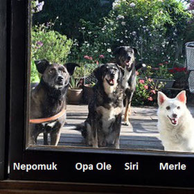 Hier die Vierer Bande mit Gasthund Nepomuk nach dem Morgenspaziergang. Alle warten auf das Öffnen der Terrassentür und hoffen, dass serviert ist…….