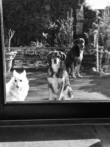 Der Blick auf die Terrasse zeigt vorn Merle(Schumen 2016)in der Mitte Ole (Schumen 2019)und hinten sitzt unsere Siri (Kroatien 2013)