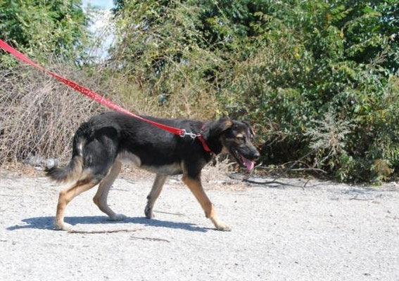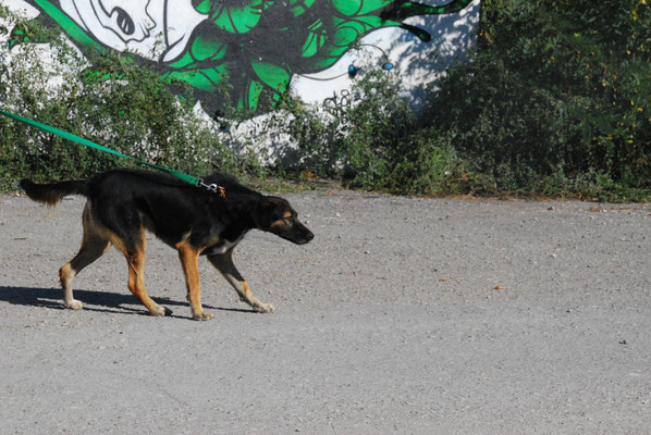 Wie man auf dem Video sieht, läuft Raffi ganz entspannt und souverän an der Leine. Er freut sich so sehr über die Abwechslung, dass er regelrecht tänzelt und freudig von links nach rechts läuft.