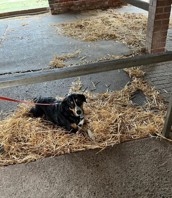 Gila ist mittlerweile ein Klinik-/Bürohund und geht regelmäßig mit Lukas zur Arbeit. Das macht sie ganz prima und gefällt ihr gut.