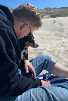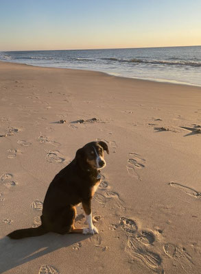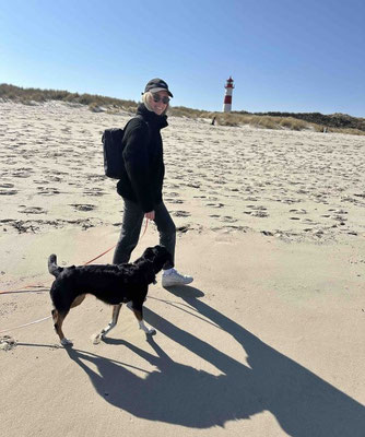 Im März letzten Jahres hat Gila mit dem linken Bein angefangen zu humpeln. Daraufhin wurde bei ihr eine angeborene Hüftdysplasie auf beiden Seiten diagnostiziert. Das war natürlich erstmal ein großer Schock für uns. Zum Glück haben wir einen guten Tierarzt mit Spezialisierung auf Orthopädie gefunden. Zuerst wurde es konservativ mit Tabletten und Co therapiert, weil sie noch im Wachstum war. Im August wurde Gila dann aber operiert. Es wurde eine Femurkopfresektion durchgeführt. Das hat sie gut überstanden und konnte 6 Wochen später im Urlaub auf Sylt schon wieder rumrennen.