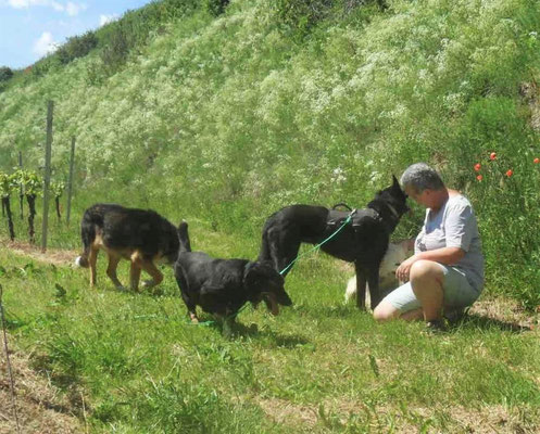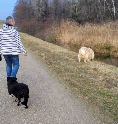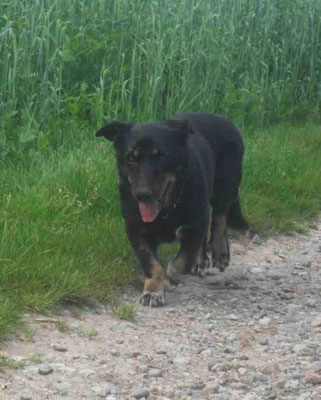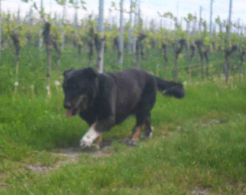 Vor vier Wochen hat sie meinem alten Lorenzo (ein 13-jähriger Schweizer Sennenhund) ein totes Huhn abgenommen, welches Lorenzo nahe einem Wald auf einem Biomüllhaufen gefunden hatte. Rosi ist zu Lorenzo hin, hat das Huhn beschnuppert und wohl befunden, dass es noch brauchbar wäre, hat Lorenzo kurz angeknurrt und dieser hat dann vor Schreck das Huhn fallen lassen!!! Und Rosi ist dann ganz stolz mit hoch erhobenem Haupt und dem Huhn davon getrabt... Und ich hatte Mühe, es ihr wieder abzujagen...