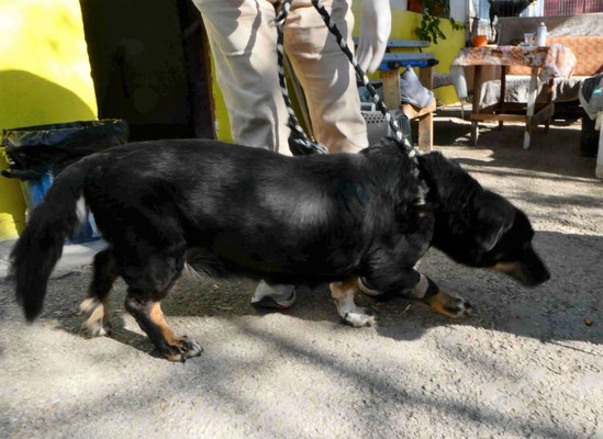 Vor zwei Wochen haben wir am Sonntag noch einen sehr langen, strammen Spaziergang von 2,5 Stunden gemacht. Am Montag hat Rosi leicht gehumpelt, aber Dienstag ging es schon wieder gut und sie ist wieder 1,5 Stunden mitgelaufen! Und ab Mittwoch wollte sie plötzlich nicht mehr richtig, ist nur noch zum Pinkeln raus und gleich wieder rein... Sie lief auch ganz schlecht. Die Tierärztin hat dann einen Bandscheibenvorfall festgestellt, Rosi bekam Schmerzmittel und ich dachte nach zwei Tagen auch, dass es besser würde... Aber dann mussten stärkere Schmerzmittel eingesetzt werden und ich hatte den Eindruck, dass sie gar nicht mehr anschlugen!