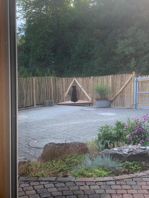 Holli liebt es auf ihrer neuen, eigenen Terasse die Straße zu beobachten und Alfi sucht sich bei der Hitze ein kühles Fleckchen im Garten.
