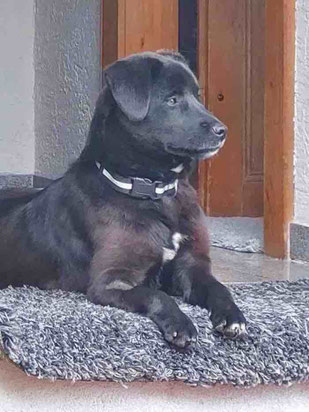 Er ist nach so kurzer Zeit schon stubenrein und läuft super an der Leine. Spaziergänge sind ohnehin aufregend. Im Garten hört er sogar schon auf seinen Namen, wenn man ihn ruft. Im Auto mitfahren bereitet ihm selbst nach dem langen und anstrengenden Transport aus Bulgarien keinerlei Probleme und auch den Pferdestall hat er schon kennengelernt.