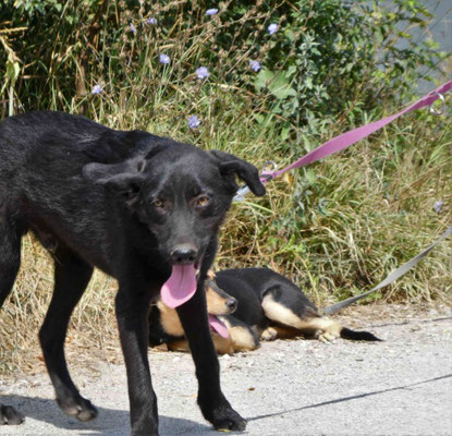 Roy ist der größere der beiden sowie der offenere. Schon als kleines Würmchen kam er an, wenn wir in seinen Auslauf kamen, und nahm Leckerli aus der Hand. Er zeigte sich uns gegenüber recht offen, obwohl er vermutlich auf der Straße keinen Kontakt zu Menschen hatte. Ringo hingegen war und ist der ängstlichere und lässt bisher keinen Kontakt zu. Er ergreift eher die Flucht.