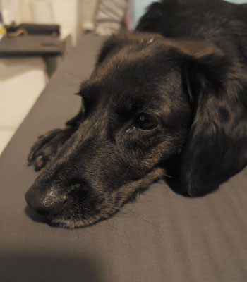 Nach der Bindehautentzündung vor einiger Zweit hatte er anschließend zwei entzündete Stellen am Kopf, die auch biopsiert werden mussten. Es stellte sich heraus, dass auch die auf Allergien zurückzuführen sind. Seit einem knappen Monat bekommt Hubert Apoquel und es ist das erste Mal seit langem, dass er sich nichts mehr aufkratzt.