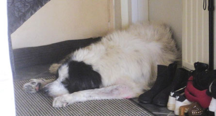 Puck wurde vor kurzem gebissen. Deshalb durfte die letzte Nacht vor seiner Ausreise noch einmal auf einer Couch schlafen!