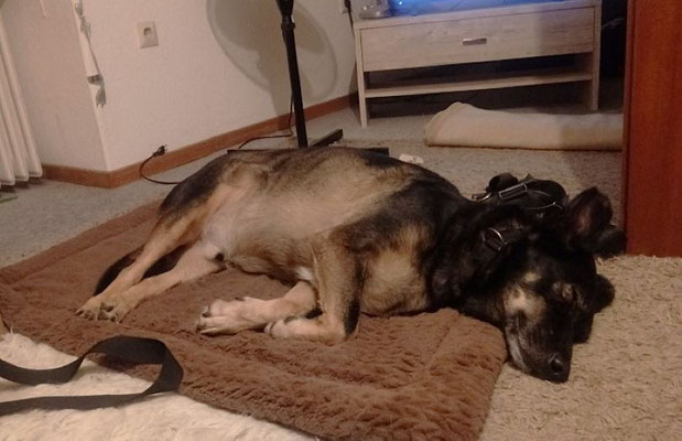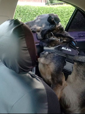 Alan sieht aus wie ein tiefergelegter Schäferhund, ist sehr lieb und sozial. Wir haben ihn nach einigen Tagen in einen Auslauf gebracht und dort hat er sich problemlos eingefügt.