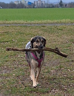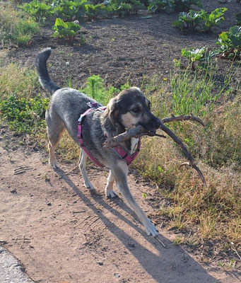 Ihre große Leidenschaft ist Stöckchen, (manchmal auch Äste) sammeln, sie trägt sie den ganzen Weg bis nach Hause.