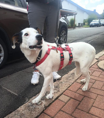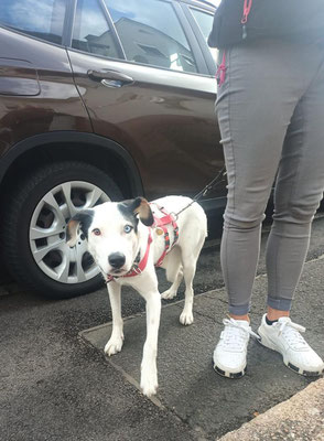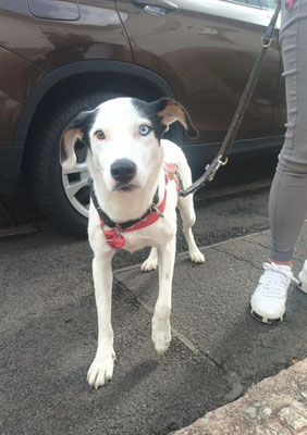 Auf andere Hunde reagiert sie sehr positiv, fremde Menschen machen ihr jedoch noch Angst. Wenn man dann weiterläuft, ist die Neugierde aber so groß, dass sie sich vorsichtig von hinten anschleicht, den Kopf reckt und die Nase nach dem neuen Geruch ausstreckt. Sie ist eine wunderbare, junge Hündin mit ganz viel Potenzial. Sie ist nun auch erst zwei Tage hier und für die kurze Zeit macht sie alles ganz prima mit.