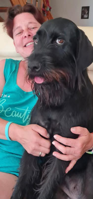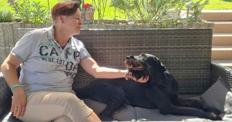 Der große Hund, der sich an sein Frauchen lehnt, könnte Imalas Mutter sein, sie ist eine Rieseschnautzerhündin.