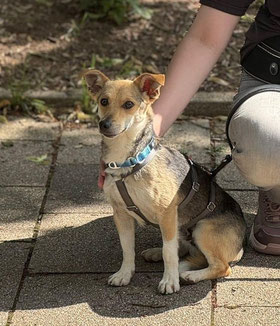 Casperle braucht noch ein wenig Übung an der Leine. Das Angebundensein ist ihm noch unheimlich. Es kommt vor, dass er in die Leine springt und auch in diese beißt. Je mehr neue Erfahrungen er macht, desto mehr Vertrauen und Sicherheit kann er auch aufbauen. Casperle braucht ein bisschen Zeit, wird sich aber an seinen Menschen orientieren und kleine Herausforderungen meistern.