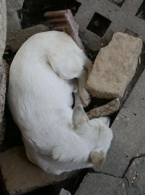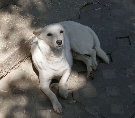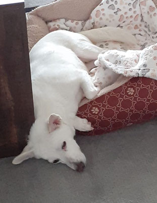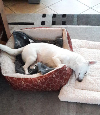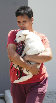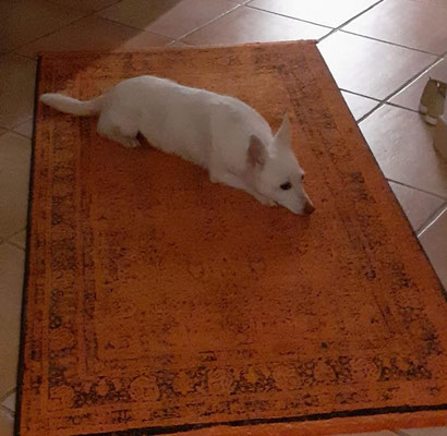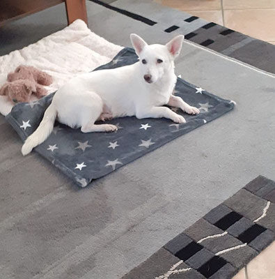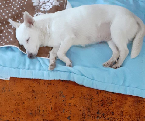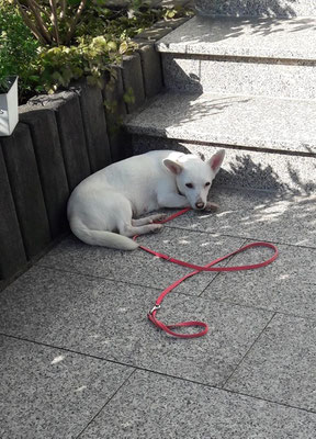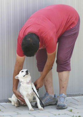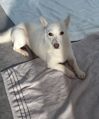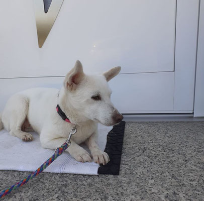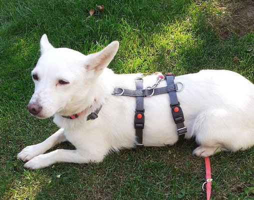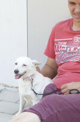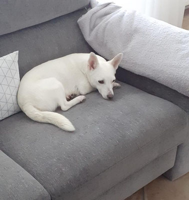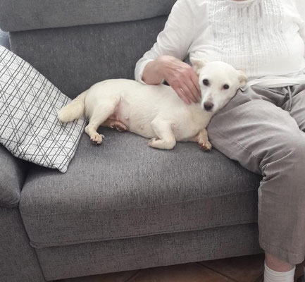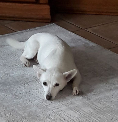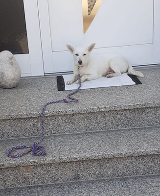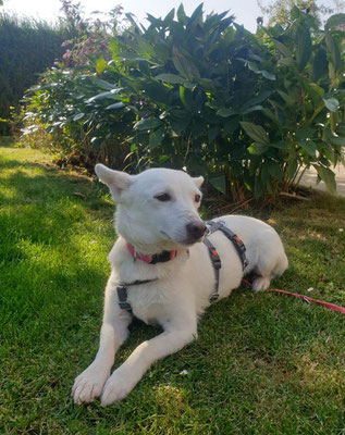 Man muss ihr einfach Zeit für alles Neue geben und geduldig sein. Im Haus hat sie sich an alle täglichen Abläufe sehr gut gewöhnt und ist einfach nur lieb und unproblematisch. Sie kommt nun schon zur Tür wenn es Gassi geht und lässt sich brav das Geschirr anziehen. Für ein Leckerchen macht sie sogar schon „Sitz“. Gerne liegt sie auch vor der Haustür in der Sonne und beobachtet mich bei der Arbeit im Vorgarten.