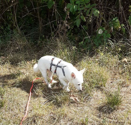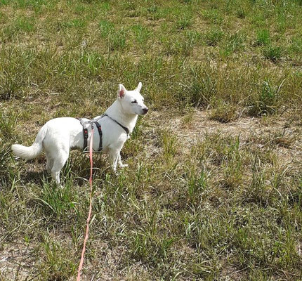 Heute möchte ich über einige Fortschritte bei Masha berichten. Spaziergänge im Feld waren und sind es teilweise immer noch, eine große Herausforderung für sie. An manchen Tagen geht es sehr gut und dann ist es wieder schwieriger. Trotzdem geht es schon sehr viel besser. Ich habe herausgefunden, dass sie lieber erstmal die Straße entlangläuft. Wenn wir danach auf Feldwege einbiegen ist es weitaus einfacher für sie. Masha schnüffelt dann ausgiebig und wälzt sich genüsslich im Gras, fordert mich sogar auf mit ihr zu spielen.
