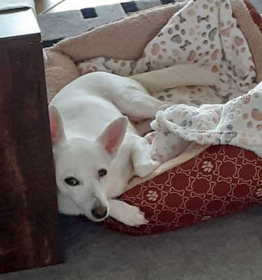 Die zauberhafte Masha kam am 16.08.2025 zu mir zur Pflege und es gibt ein paar erste Eindrücke über sie zu berichten. Sie braucht jedoch tatsächlich noch etwas Zeit um sich einzuleben. Im Haus kommt sie sehr gut zurecht und hat keinerlei Probleme mit den verschiedenen, für sie neuen, Eindrücken wie Fernseher, Küchengeräte, Türklingel etc. Die Treppe in den ersten Stock ist sie sofort ohne Probleme hoch gelaufen. Gerne liegt sie in ihrem Körbchen und beobachtet alles in Ruhe. Dann kommt sie zwischendurch immer an um sich Streicheleinheiten abzuholen. Zuhause fühlt sie sich sehr wohl. Eine Stunde ist sie bisher auch schon alleine geblieben.