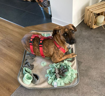 Urmela ist noch immer perfekt stubenrein, fährt gut Auto und auch mit dem Zuhause alleine bleiben hat das Hundemädchen keinerlei Probleme.