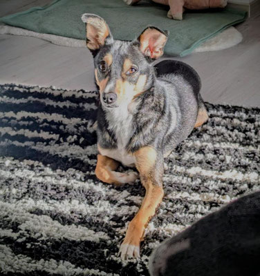 Im Haus liegt Vitani fast ausschließlich unter der Eckbank. In den frühen Morgenstunden und kurz bevor es zum Gassi geht, schleicht sie sich jedoch raus um zu spielen oder zu zeigen, dass sie noch anwesend ist und gerne mitkommen möchte. Fressen tut sie auch noch unter der Eckbank.