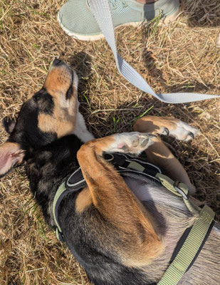 Jüngste Ereignisse haben gezeigt, dass es nochmal zu Rückschritten kommen kann, wenn unvorhergesehene Ereignisse eintreten. Die reine Anwesenheit einer Person neben einem geparkten Auto hat Vitani zweieinhalb Tage derart irritiert, dass ich sie kaum anfassen konnte. Nach einer größeren Gassirunde (4,5 km) durch den Wald, hat sie diesen Schalter zum Glück wieder umgelegt.