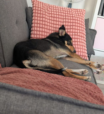 So fasst sie all ihren Mut zusammen, um ein bisschen gekraut zu werden und ist sichtlich enttäuscht, wenn ich mich ins Bett verabschiede. Das ist schon ein großer Fortschritt für die zierliche Hündin nach der kurzen Zeit, die sie erst in Deutschland ist.