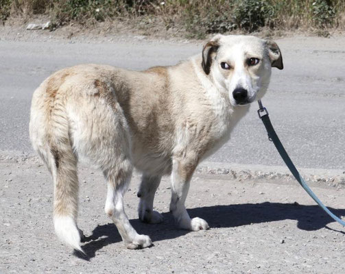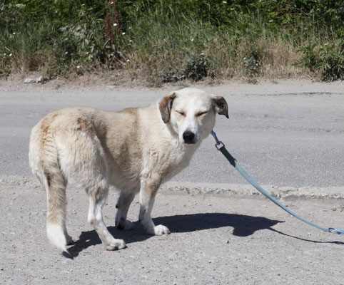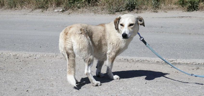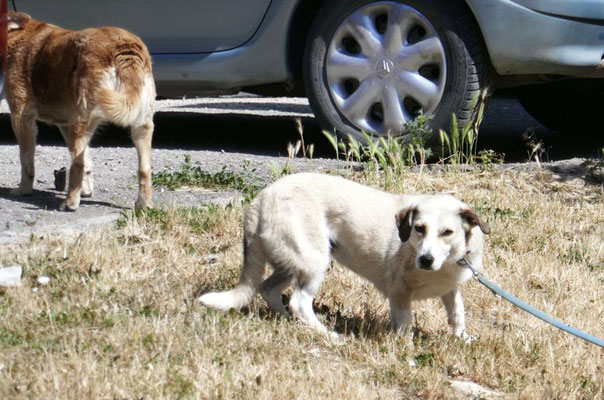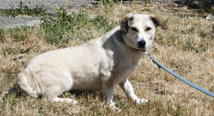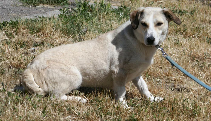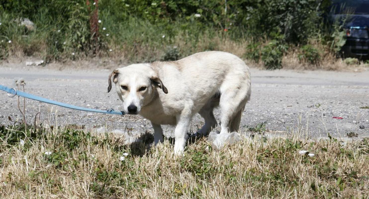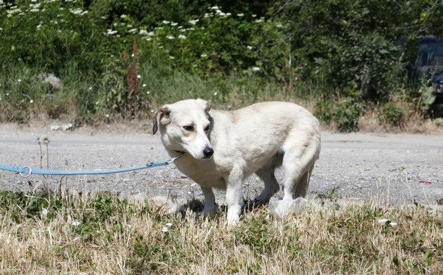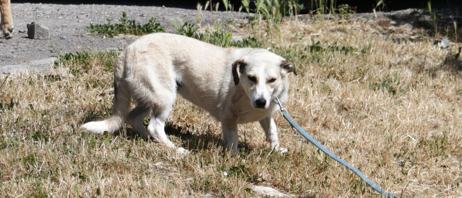 Caris ist jedoch eine sehr sanfte Hündin, die sich fangen lässt, wenn man sie für einen kurzen Ausflug mit nach draußen nehmen möchte. Bei ihrem ersten Ausflug reagierte sie noch etwas panisch, im Mai war sie schon ein wenig ruhiger, aber immer noch verunsichert. Immerhin war ihre Neugierde geweckt, sie schnüffelte die Wiese vor dem Tierheim ab und lief sogar ein paar Schritte. Sie wird wahrscheinlich viel Zeit brauchen, bis sie eine engere Bindung zum Menschen eingehen kann, denn das hat sie leider nie gelernt.
