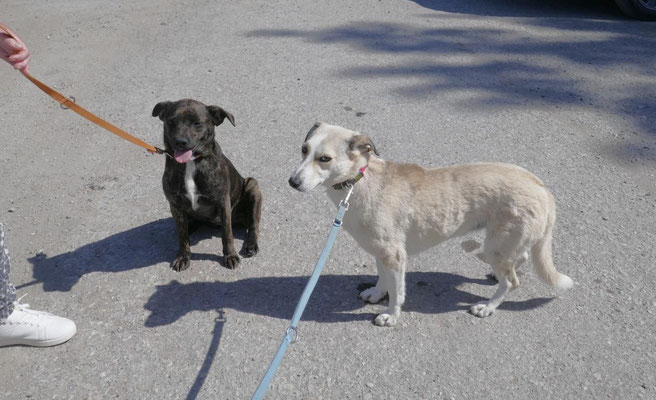 Draußen noch ängstlich an der Leine, setzt sich hin und bewegt sich nicht