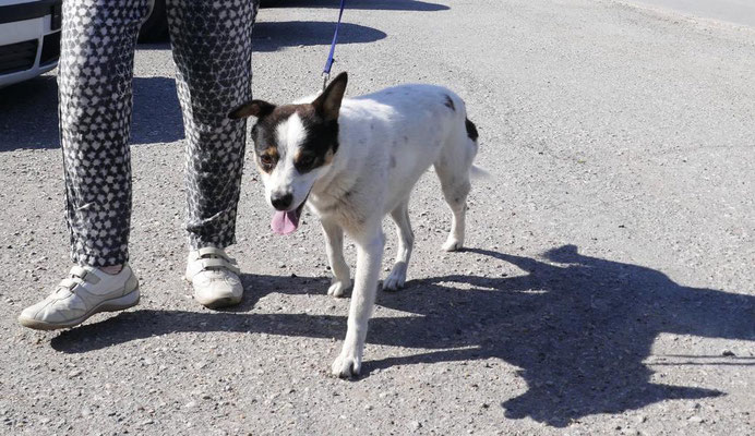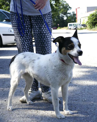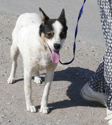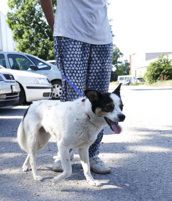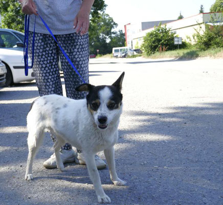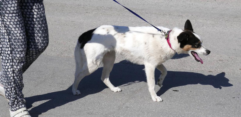 Bei ihrem ersten Spaziergang an der Leine war sie noch ein wenig unsicher. Ob es an der Leine lag oder an der ihr unbekannten Umgebung, wissen wir nicht. Sie bringt aber viel Potenzial mit und wird sich in einem Zuhause weiterentwickeln.
