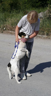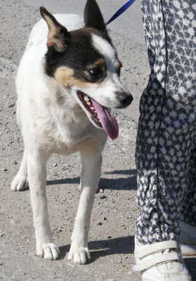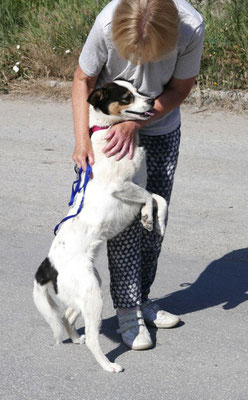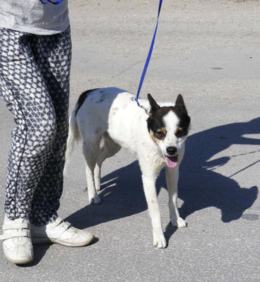 Sie hat eine angenehme Größe von etwa 45-46 cm. Bei fremden Menschen ist sie anfangs ein wenig skeptisch, wenn sie aber merkt, dass ihr nichts passiert, kommt sie gern auf uns zu und lässt sich streicheln. Nachdem ich ihr etwas Leckeres gegeben hatte, krabbelte sie sogar auf meinen Schoß und legte ihren Kopf auf meine Schulter. Wir haben sie als liebebedürftige Hündin erlebt.