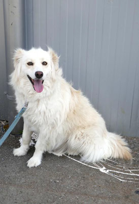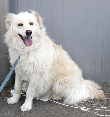 Wir schätzen Fenella auf etwa 2,5 bis 3 Jahre; sie könnte im Juni 2022 geboren worden sein. Sicher steckt in ihr etwas vom Golden Retriever. Sie sieht zumindest so aus, wenn auch im Kleinformat.