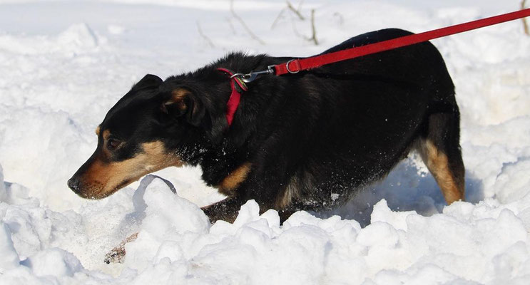 Für den ersten Spaziergang an der Leine mussten wir sie erst einmal vorsichtig aus ihrem Auslauf holen. Beim Ausflug vor das Tierheim zeigte sie sich dann aber recht souverän. Sie hat eine sehr angenehme Schulterhöhe von ca. 47/48 cm.