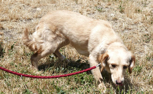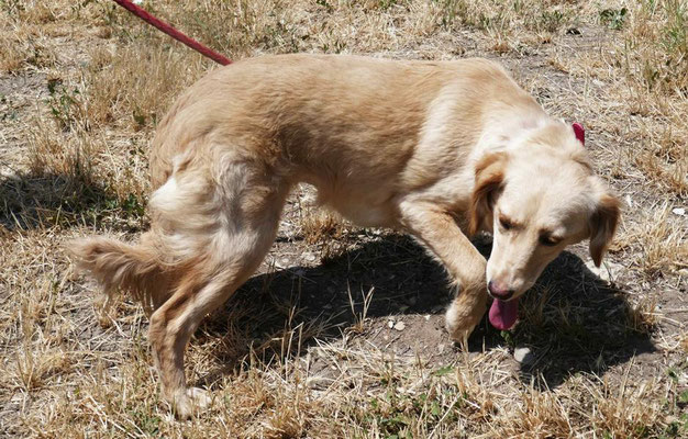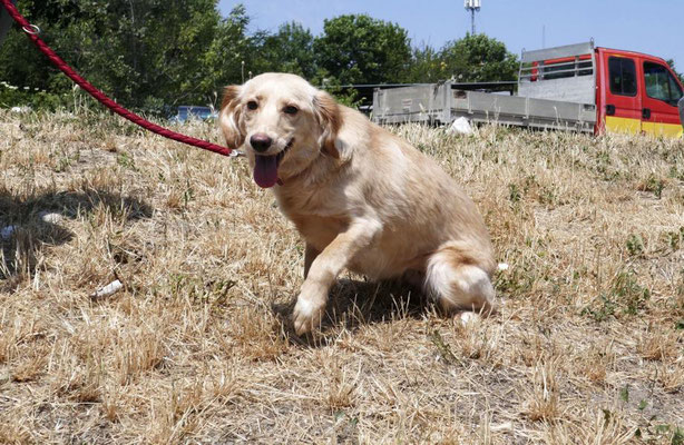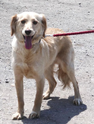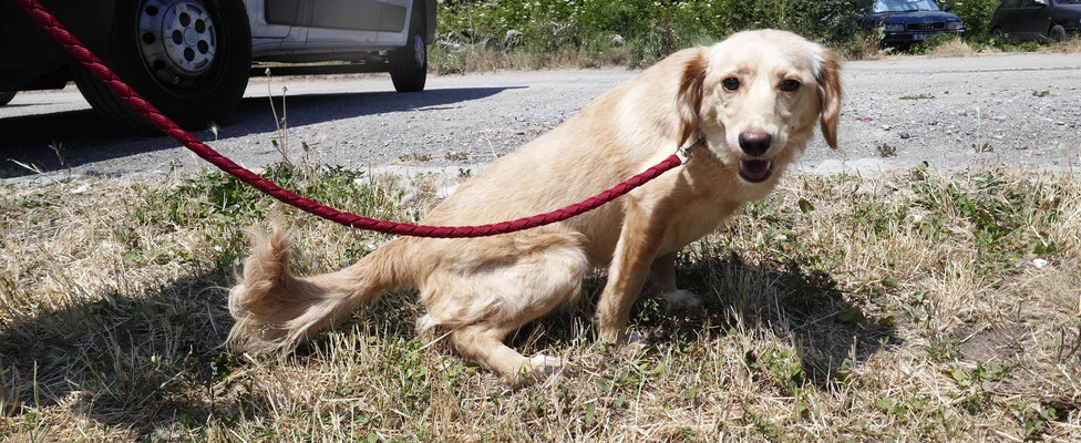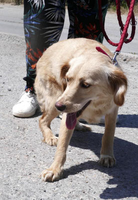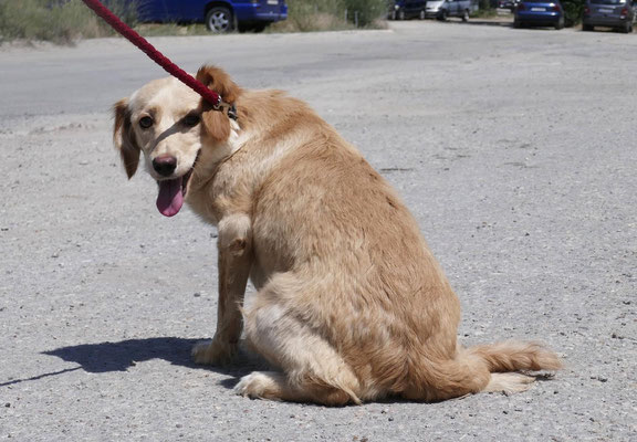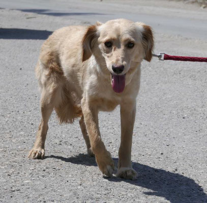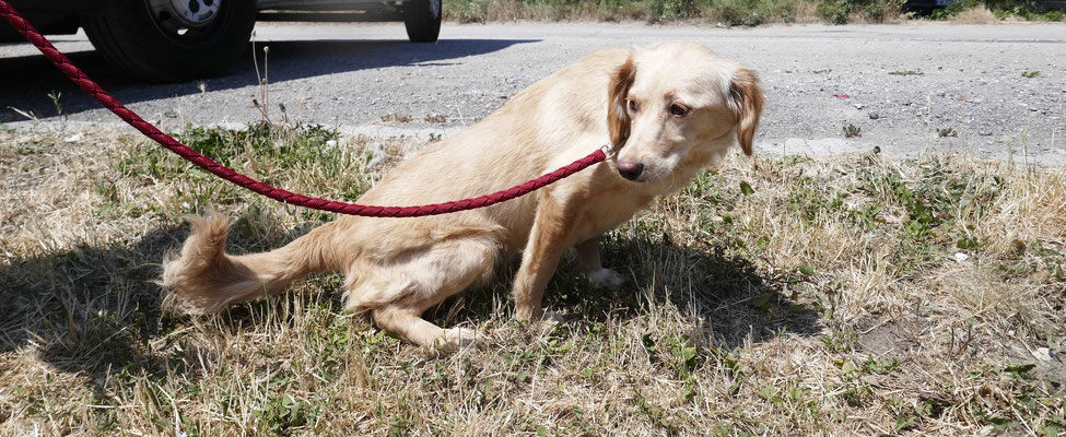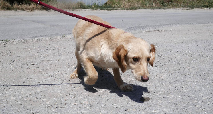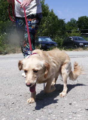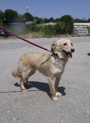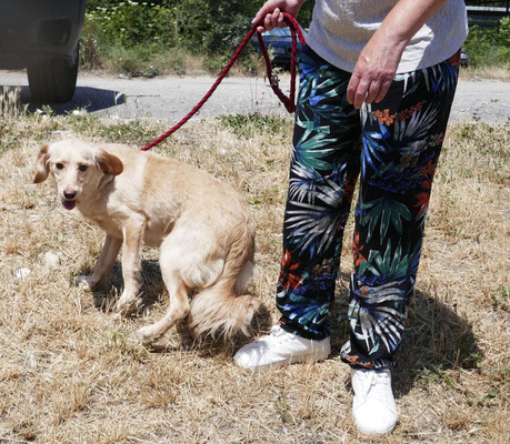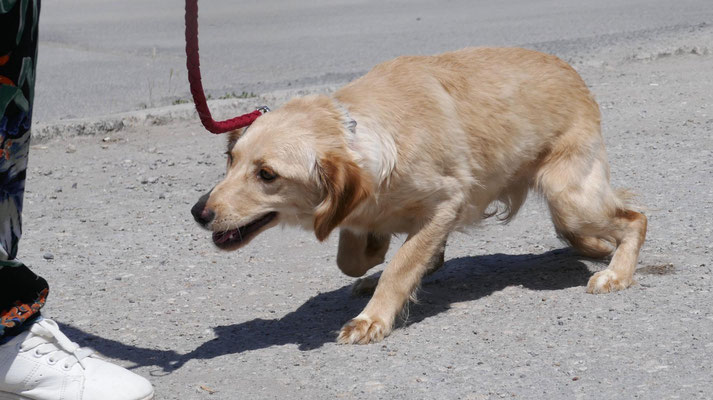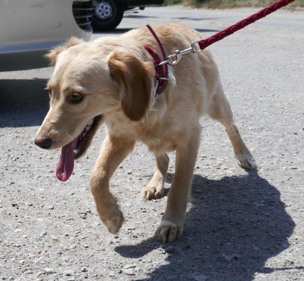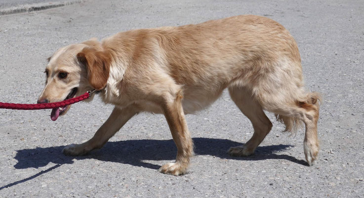 Matila hat eine Schulterhöhe von ca. 42/43 cm. An der Leine ist sie noch ein wenig unsicher und braucht noch etwas Übung, um flüssig mitzulaufen.