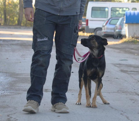 Bei ihrem ersten Ausflug an der Leine vor das Tierheim wollte Njeri noch nicht laufen. Alles war ihr noch zu aufregend und sie ist noch sehr unsicher. Etwas Übung wird sie brauchen, viel Geduld, Einfühlungsvermögen aber auch Menschen, die sie klar führen und ihr Sicherheit vermitteln.