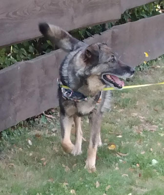 Puh ist zwar schon ein wenig grau um die Schnauze, trotzdem schätzen wir sie anhand des Zahnstatus auf etwa 5 Jahre. Sie dürfte etwa im November 2017 das Licht der Welt erblickt haben. Ihre Schulterhöhe beträgt ca. 55-57 cm.