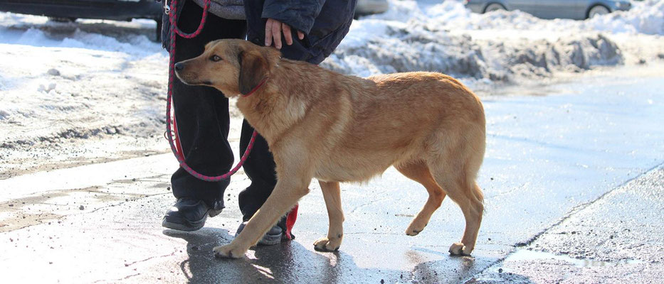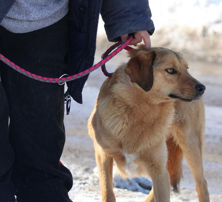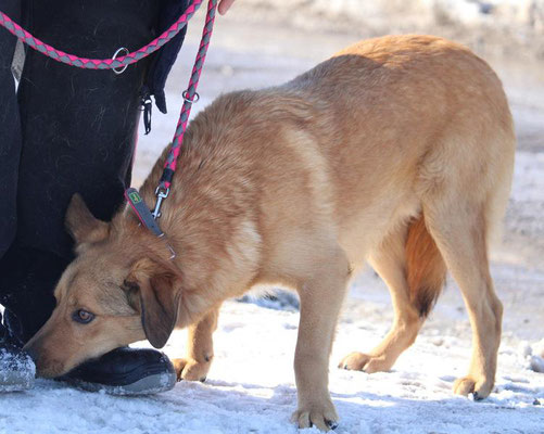 Draußen zeigt sich Abel vorsichtig, sucht aber Nähe zu vertrauten Menschen wie Zlatina, von der er Sicherheit bekommt. Straßenlärm beeindruckt ihn erstaunlich wenig – selbst ein vorbeifahrendes Motorrad oder ein LKW brachten ihn nicht aus der Ruhe. An der Leine läuft er noch unsicher, und es ist nicht leicht, ihn im Auslauf einzufangen, da er lieber auf Distanz bleibt.