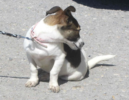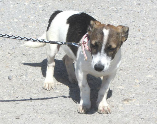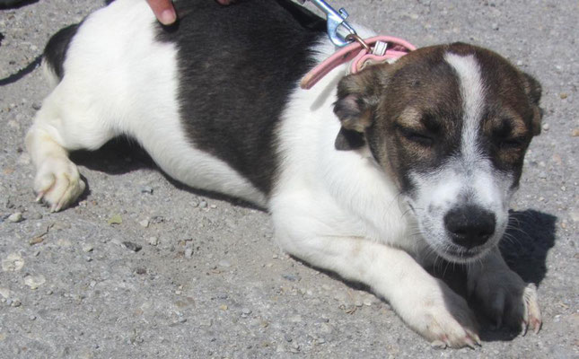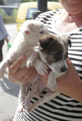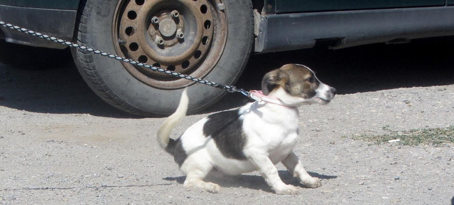 Als sie das erste Mal mit Halsband und Leine mit der etwas größeren Welt vor dem Tierheim vertraut gemacht wurden, haben sie das schön mitgemacht, wollten jedoch noch nicht laufen. Das ist aber völlig normal, denn bei dem ersten Ausflug in unbekanntes Terrain stürmt so viel auf die jungen Hunde ein, so dass sie sich erst mal in aller Ruhe sortieren müssen. Alles ist neu, ungewohnt und unbekannt. Das muss verarbeitet werden und braucht einfach etwas Zeit. Übung macht bekanntlich den Meister.
